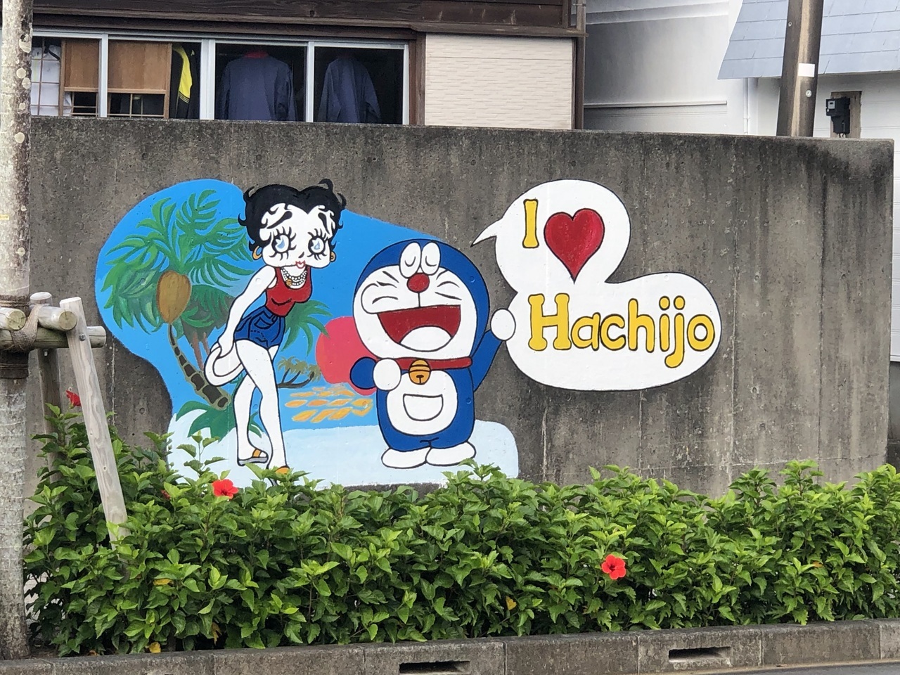 ネットで見た海の近くのホテルにしたのですが、空港から近いのか遠いのかもよくわからない。勿論レンタカーの事前予約をしようかとも思ったのですが、空港の近くで借りるべきか、宿の近くが良いのか悩み、とりあえずホテルの送迎も事前に頼んでいなかったため、空港のタクシーに乗りました。タクシーの運転手さんに聞いてわかったことは・・・宿から空港は少し距離があること、繁華街は島の中心ではあるが、ホテルもレンタカーも店もそこそこ散らばっていること、流しのタクシーはおらず、全て宿や店から呼ぶしかないこと、島を一周するなら車がよさそうなこと、でした。ただ、その日は私が来る前に雨は降ったらしいのですが、すでに止んで晴れていたため、暖かく11月には思えないように感じ、レンタサイクルにチャレンジしました。そして写真の、そう、「I ♥ HACHIJO」の看板に出会いました!!